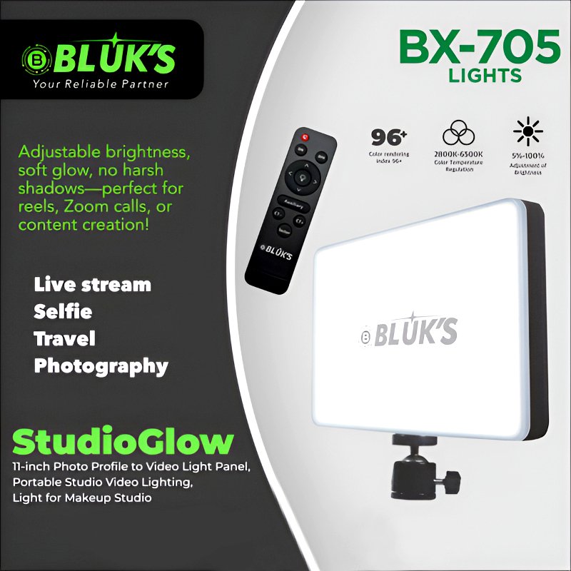 Short Description: Product: LED Panel Light Brand: BLUK’S Model: BX-705 Color: Black Material: ABS Plastic Size: (approx)11 inches (Ultra-slim design) CRI (Color Rendering Index): 96+ for natural colors Color Temperature: Adjustable 2100K – 6500K (warm to cool) Brightness: 5% – 100% dimmable Control: Wireless remote included Applications: Streaming, photography, makeup, travel, studio lighting Mounting: Adjustable bracket for easy positioning Portability: Lightweight and compact design Product Description: Elevate your lighting setup with the BLUK’S BX-705 StudioGlow. This ultra-slim 11-inch LED panel delivers soft, evenly diffused light—perfect for live streaming, vlogging, selfies, travel, photography, and professional makeup studios. With adjustable brightness (5%–100%) and a wide color temperature range (2,100 K–6,500 K), it adapts seamlessly to any environment, ensuring studio-quality results every time. The included wireless remote control makes adjustments effortless, letting you focus on creating stunning content. Designed for content creators, makeup artists, and photographers who demand precision and portability, the BX-705 StudioGlow is your reliable partner for flawless lighting. What’s in the box: 1 x LED Panel Light, 1 x Remote Control Weight: 0.4 SKU: 250709125037