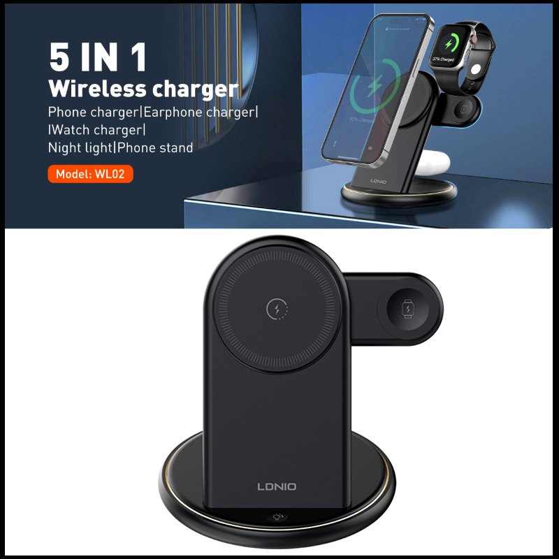 Short Description: Type: 5-in-1 Wireless Charging Station Brand: LDNIO Model: WL02 Color: Black Input (USB-C): 5V=3A, 9V=3A, 12V=2.5A (30W Max) Mobile Phones Output: 5W / 7.5W / 10W / 15W (Max) Smartwatches Output: 2.5W (Max) Earphone Output: 5W (Max) LED Light Output: 3W (Max) Total Output Power: 25.5W Max Magnetic Stand: 180-degree rotation Magnet Strength: 17 N52 magnets Charging Protocols: PD & QC3.0 fast charging Safety Features: Foreign object detection, overheat protection Product Description: The LDNIO WL02 5-in-1 Wireless Charger is a premium MagSafe-compatible charging station designed to provide fast, efficient, and safe wireless charging for multiple devices simultaneously. It features wireless charging for mobile phones, smartwatches, and earphones, an integrated LED night light, and a 180-degree rotating hidden stand for flexible use in various settings, including your bedroom, office, or while traveling. This charger is equipped with a USB-C input that supports PD and QC3.0 fast charging, ensuring efficient energy transfer to your devices. The built-in N52 magnets provide a strong and stable grip, keeping your devices securely in place during charging. The charger also includes intelligent foreign object detection and overheat protection to prevent any potential issues, ensuring safety while in use. Designed with user convenience in mind, the ergonomic breathing light effect offers soft, ambient illumination, making it ideal for bedside use without disturbing your sleep. The smart chip technology automatically adjusts the charging speed to suit the needs of each device, while the touch control button provides easy operation and prevents accidental drops of your phone or other devices. Crafted from high-quality heat-resistant materials, the LDNIO WL02 ensures long-lasting durability and optimal charging performance. Whether at home, the office, or on the go, this all-in-one wireless charging station offers a perfect blend of convenience, safety, and versatility in a sleek and practical design. Weight: 0.3 SKU: 250304133647