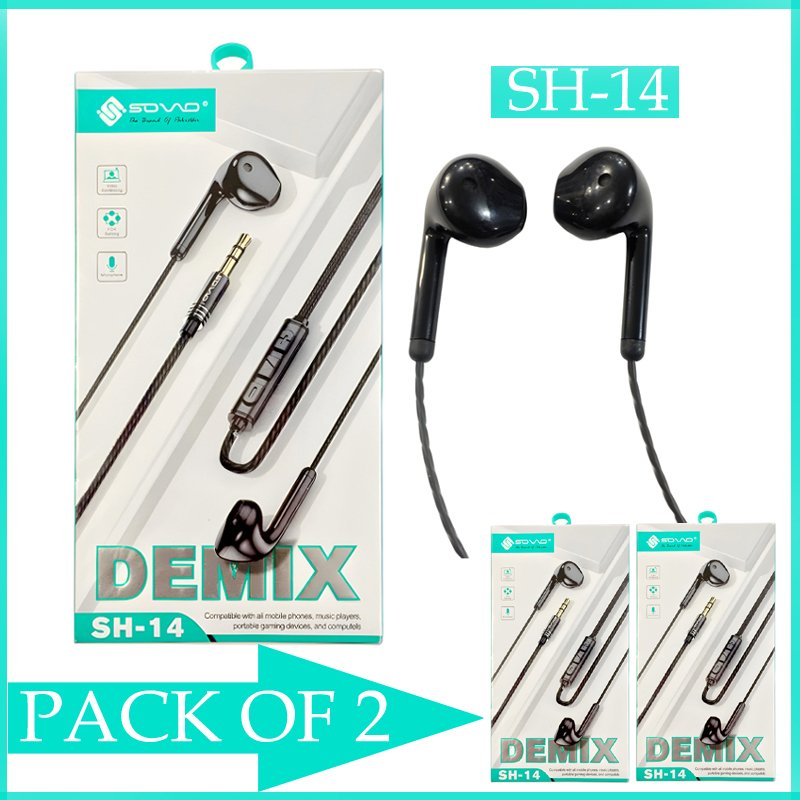 Short Description: Type: Handsfree Brand: SOVO Model: SH-14(DEMIX) Color: Black Jack: 3.5mm Microphone: Built-in Features: Comfortable, Noise Reduction Quantity: 2 Pcs Product Description: Experience crystal-clear audio with the SOVO SH-14 DEMIX Stereo Sound Handsfree, perfect for video conferencing, gaming, and music. Compatible with all mobile phones, music players, portable gaming devices, and computers, this versatile headset features in-ear detection, a 120cm line length, and advanced call noise reduction technology. The specially designed lead tone chamber effectively filters background noise, while the digital noise reduction algorithm ensures clear and stable calls even in noisy environments. Enjoy an immersive experience with the SOVO SH-14 DEMIX Stereo Sound Handsfree. What’s in the box: 2 x SH-14 Handsfree Weight: 0.2 SKU: 240425104309