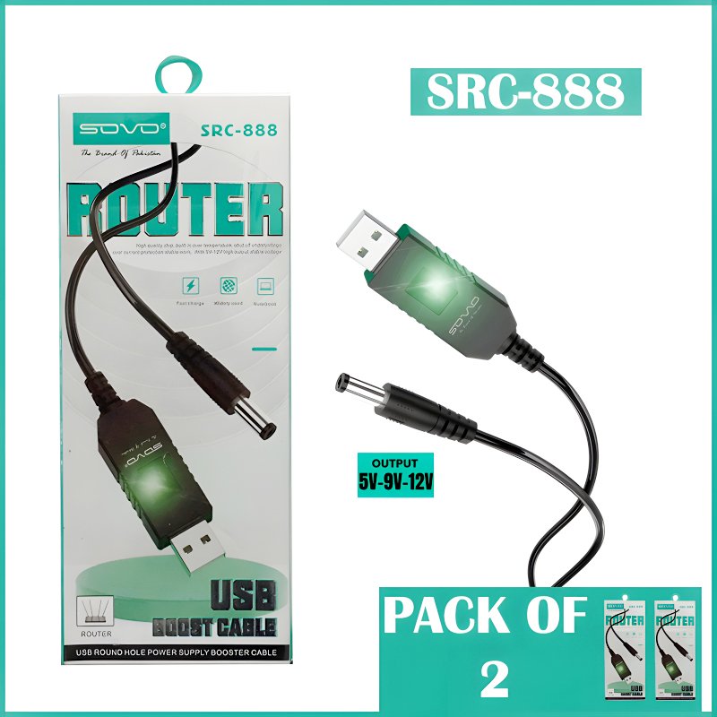 Short Description: Type: Router Cable Brand: SOVO Model: SRC-888 Voltage Output: 5V – 12V Connector Type: USB round-hole design Safety Features: High-end metal components for safe charging Usage: Ideal for notebooks and other devices Quantity: 2 Pcs Product Description: Experience uninterrupted and reliable router performance with the Sovo Router Cable SRC-888. This innovative cable is designed with USB connectors, allowing you to power your router from any standard wall charger or power bank, ensuring an efficient and stable connection. Equipped with a high-quality chip and built-in over-temperature, undervoltage, and over-current protection, this cable ensures stable performance. With a voltage output ranging from 5V to 12V, it supports a wide range of devices, including notebooks, and features fast charging capability. The USB round-hole power supply booster cable design enhances convenience, while its high-toughness materials undergo rigorous testing for durability and resistance to bending and fracture. Plus, the use of high-end metal components minimizes damage to the router, ensuring safer and faster charging. What’s in the box: 2 x Router Cables Weight: 0.2 SKU: 240323094851